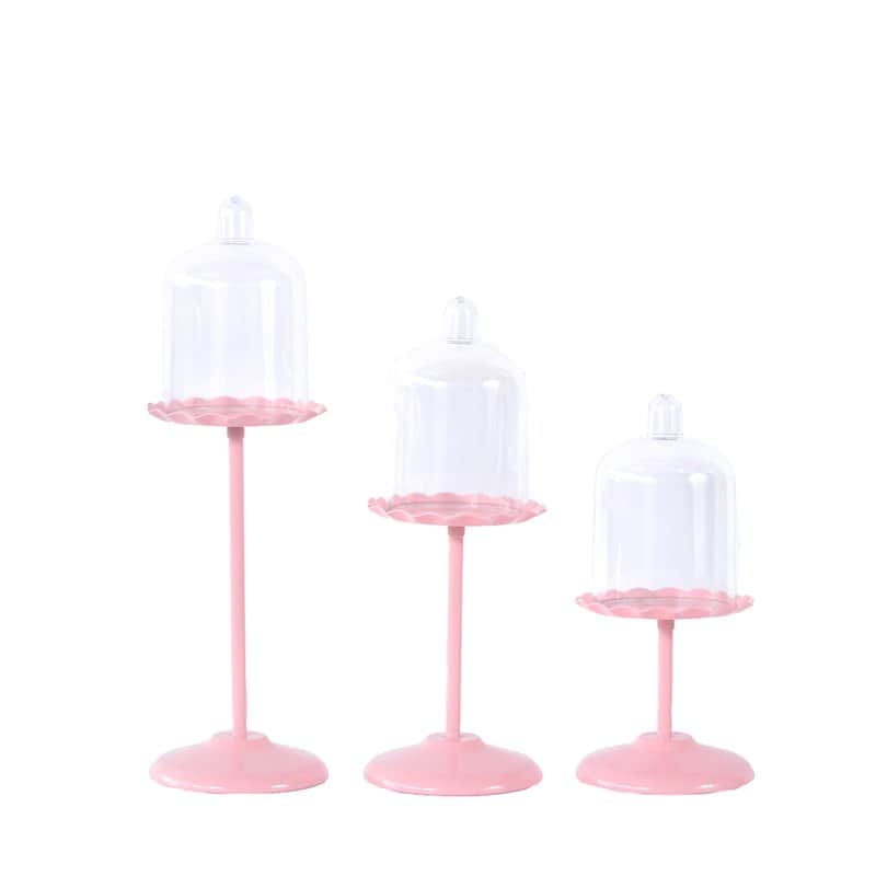 מעמד קאפקייקס/נרות ורוד עשוי מתכת עמידה ומכסה פלסטיק קשיח קיים בשלושה גבהים