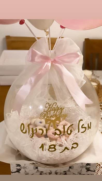 בלון דונאטס בגווני ורוד לבן כולל כיתוב של חמש מילים, ובפנים כ 43 מיני דונאטס בשילוב זר 5 בלוני הליום כרום