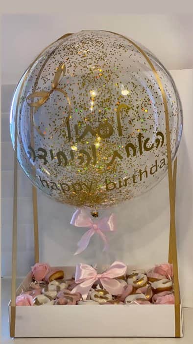 מארז של כ 43 מיני דונאטס עם בלון פלסטיק נצנצים וכיתוב של כחמש מילים